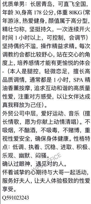 征友要求:不滥交,平时很注重性爱安全,确保双方健康,追求品质,满足双方,释放自己,懂得迎合女人的心意,寻找珠三角地区高颜值,有气质的夫妻、单女,有性趣的可以加我扣扣:叁幺捌妻零陆捌妻捌,非诚勿扰,谢谢!