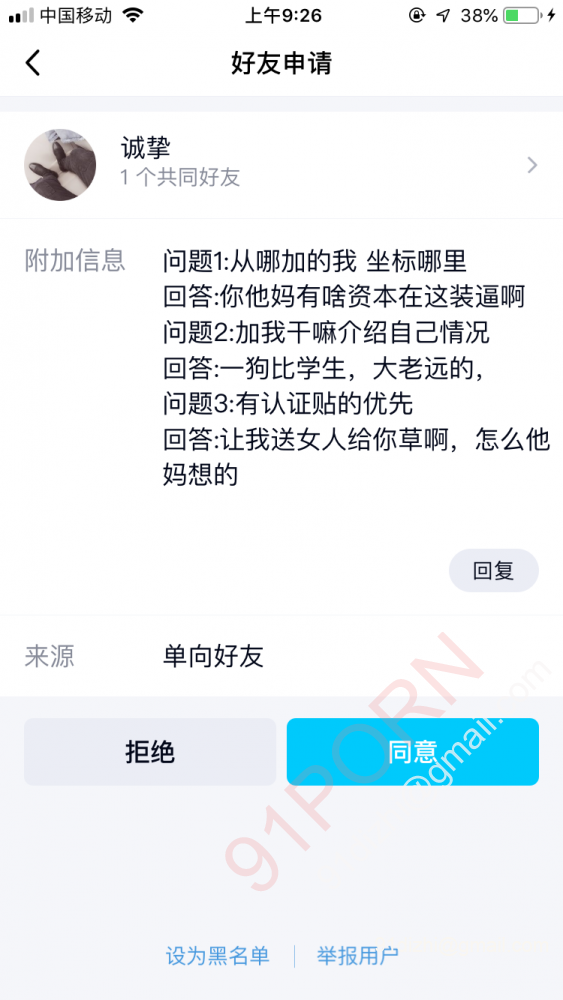 简单说下我看法 就凭这个人加好友时连最基本的地理位置都不注意就可以分辨是个不是非常靠谱的人 再根据他的说话素质行为方式基本能断定是个不靠谱的人 不合适大家直接删了就好了 何须多言 话不投机半句多 最后想说明一下 单男是一个人数众多的群体 我们虽说是单 但不是说就不需要相互尊重 这位老哥你虽是情侣 但也不是你口吐芬芳的理由 送你成龙大哥的一句话 看你几时完